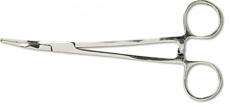 Zange aus rostfreier Stahl, mit Feststeller und gebogener Spitze.