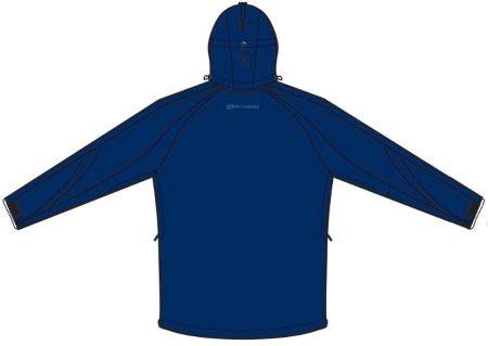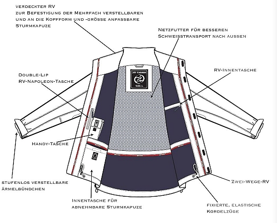 Sportiv geschnittene atmungsaktive wasserdichte Jacke aus hochwertigem leichtem Struktur-Material mit voll verschweißten Nähten und Zwei-Wege Front-Reißverschluss. Am Kragen befindet sich ein verdeckter Reißverschluss zur Befestigung der mehrfach verstellbaren und an die Kopfform anpassbaren Sturmkapuze.