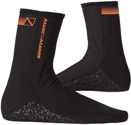 Socken aus einem nicht auftragenden enganliegenden Fleece gefütterten Spandexmaterial, das hydrophob ist, also kein Wasser aufnimmt. Die Flachnähte sind beim Tragen nicht zu spüren.