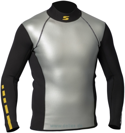 Das neue warme Top von Sandiline für die kälteren Tage. Die äußere Schicht ist aus Körperwärme reflektierendem, winddichten, wasserabweisenden und Abrieb resistentem Material, die mittlere Schicht aus 1,5 mm Neopren zur Isolation und die innere Schicht aus warmen und schnell trocknenden Fleece, angenehm zur Haut. Dieses Material bietet Wärme und Komfort für den Oberkörper. Das Top schützt den Rücken durch seinen hinten längeren Schnitt. Der Kragen ist höher geschnitten, um Wärmeverlust zu verhindern.