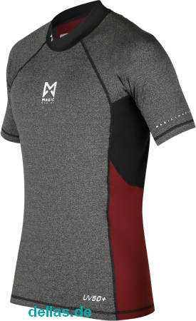 Hochwertiges kurzärmliges Rash Shirt mit Flatlock Nähten, schnell trocknendes Airstretch Material unter den Armen und auf dem Rücken. UV Schutz (UPF 50+). Hoher Kragen.