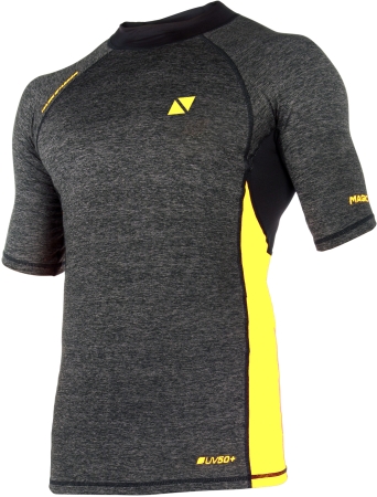 Hochwertiges kurzärmliges Rash Shirt mit Flatlock Nähten, schnell trocknendes Airstretch Material unter den Armen und auf dem Rücken. UV Schutz (UPF 50+).