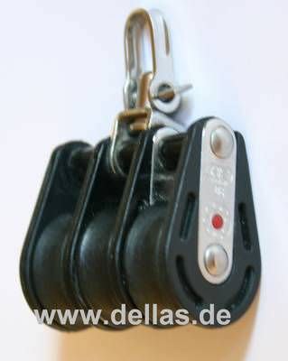 Block, mit vernietem Wirbel, 3 Rollen, Kunststoffrolle 27 x 11,5mm, Kunststoff-Kugellager, Seitenteile aus hochwertigem UV-beständigem Kunststoff, Bruchlast: 600 kg