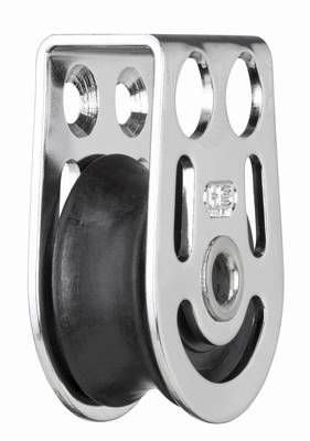 Block, mit Hohlachse, kann wahlweise liegend oder mit Hilfe der Lasche S35135 000 55 aufrechtstehend aufgeschraubt werden, Edelstahl Seitenteile, Kunststoffrolle 27 x 11mm, Kunststoff-Kugellager