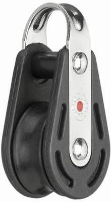 Block mit festem Bügel für maximal 8 mm Tauwerk, Rollengröße 27 x 11,5 mm, Bruchlast 600 kg, sichere Arbeitslast 150 kg, Kunststoff-Kugellager, Seitenteile aus hochwertigem UV-beständigem Kunststoff, geringes Gewicht.