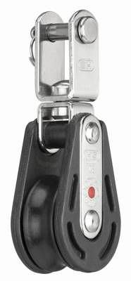 Block einfach mit U-Wirbel für maximal 8 mm Tauwerk, Rollengröße 27 x 11,5 mm, Bruchlast 600 kg, sichere Arbeitslast 150 kg, Wirbel vernietet. Kunststoff-Kugellager, Seitenteile aus hochwertigem UV-beständigem Kunststoff, geringes Gewicht.