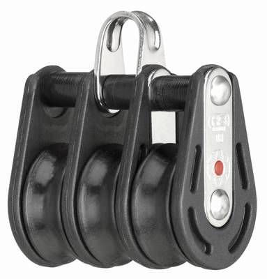 Block, mit vernietem Bügel, 3 Rollen, Kunststoffrolle 27 x 11,5mm, Kunststoff-Kugellager, Seitenteile aus hochwertigem UV-beständigem Kunststoff, Bruchlast: 600 kg