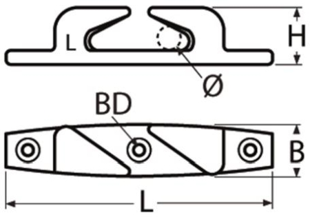 | Länge L | Breite B | Seil-Ø | Höhe H | Ausführung | Bohrloch Ø BD | Art.-Nr. |
