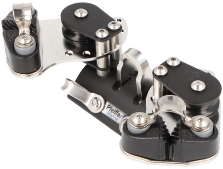 Den Travellerschlitten mit doppelter Umlenkung, Tauösen und Klemmen gibt es mit 6 Rollen (zulässige Arbeitslast 750 kg). Dieser Schlitten ist mit Edelstahlkugellager.