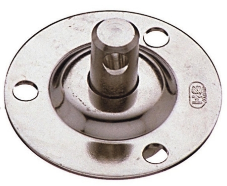 Runde Edelstahl-Grundplatte mit 360° drehbarem Bolzen, vielfältige Einsatzmöglichkeiten und einfache Befestigung dank dreier Bohrlöcher.