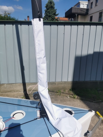 Mastpersenning zum Hochziehen, um den Carbon-Mast von Sonne zu schützen. Die Persenning hat einen teilbaren Reißverschluss. Sie wird mit dem Fall am Mast hochgezogen und der Reißverschluss gleichzeitig geschlossen. Die Persenning ist aus Polyethylen (350 g/m²), einem wasserdichten und UV-beständigen Material.