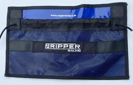 Rückseite aus PVC, Vorderseite aus Netzstoff. Oben rechts und links Verstärkungen für die Befestigung, aber noch keine Löcher. An der Vorderseite oben im Netzstoff eingelassen ein Gummi enstellbar als Verschluss.