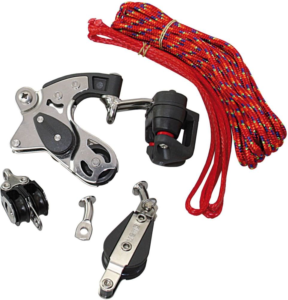 Komplettset für Niederholer bei Jollen. Das Pack enthält 1 x 20 mm Dynamic Doppelblock, 1 x Niederholerschlüssel, 27 mm Block mit Niederholerschlüssel, Fußblock mit Klemme (Block ohne Laserzeichen) und passende Tauwerkabschnitte.