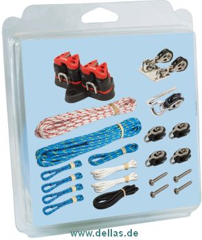 Komplettset für Vor- und Unterliekstrecker bei Jollen. Das Paket enthält enthält alle Blöcke, Klemmen und Leinen für Cunningham und Achterliekstrecker. Die Platte für die Klemmen und die Platte für die Blöcke kann einfach in die Original Löcher befestigt werden mit den im Pack enthaltenen Schrauben.Die Kombination der 4 mm Leinen und der 3 mm Dyneema Vorläufer ist ideal für die Segelkontrolle und reduziert die Reibung bei den 20 mm Kugellager Blöcken. Mastsicherung ist im Packt enthalten.