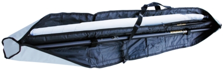 Persenning aus Heavy Duty 600D PVC beschichtetem Polyester mit 3 gepolsterten Hauptfächern für Sprit, Mast, Baum und Segel mit RV über die gesamte Länge. Beschriftungsfeld und verstellbarer Trageschlaufe