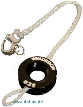 38 mm Windesign reibungsarmer Ring eingespleißt in eine Dyneema Leine, an deren einem Ende ein Schnappschäkel zur Befestigung angebracht ist. Ein extra Loop ist an der anderen Seite des Ringes eingespleißt zum einfachen Wechseln zwischen einer 1:2 oder 1:3 Großschotübersetzung.