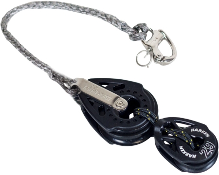 Die Harken Block-Kombination aus einem Harken 40 mm Block und einem Harken 29mm ist perfekt, um eine 4:1 Großschotübersetzung zu erreichen. Mit dem Schnappschäkel, der mit einer gespleißtem Dyneema Leine mit den Blöcke verbunden ist, lässt sich die Block-Komination leicht befestigen.
