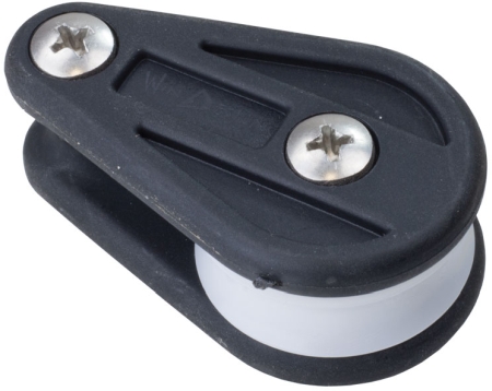 Gleitlagerblock mit 34 mm Kunststoffrolle für Schoten mit einem Ø von maximal 10 mm.