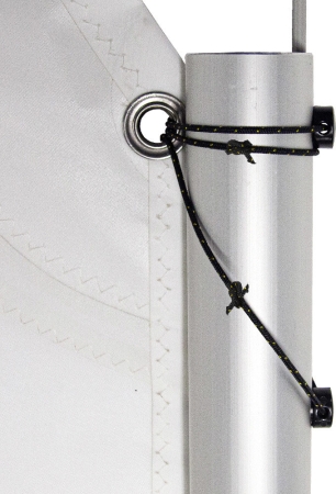 Verklickerhalter und Befestigung für das Optisegel am Top, einfache Top-Pins, mit denen die Segelbändsel außen am Mast geknotet werden, für einfache Segeleinstellung.