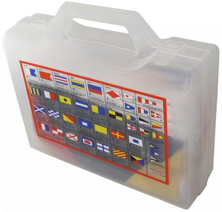 Polyester, bestehend aus 40 Flaggen (A - Z, 0 - 9, I. - III. Hilfsstander und Antwortwimpel), komplett in Segeltuchtasche mit Fächereinteilung.