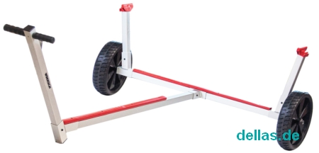 Windesign Laser®Bug-Slipwagen aus Aluminium, das Boot liegt auf den 2 Seitenstützen und auf einer speziellen Bug-Auflage, welche unter das Süllbord fasst.