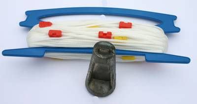 Praktisches Handlot mit 30 m markierter Flechtleine (D = 4 mm) aus Polyamid auf Haspel zum Aufwickeln, Lotgewicht aus Blei ca. 0,6 kg mit Loch für Lotspeise.