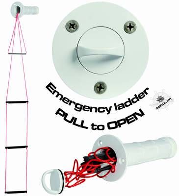 Einbaubare Rettungsleiter im wasserdichten Container aus Thermopolymer. Strickleiter aus Nylon, Tritte aus robustem Thermopolymer. Wird über der Wasserlinie montiert. Einfache Verwendung. Die im Wasser befindliche Person zieht am Verschlussring und die Leiter wird ausgeworfen. Anzahl Stufen: 3 Stück. Länge: 110 cm