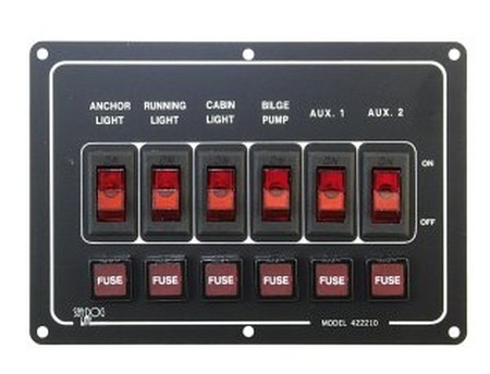 6-fach Schalterpaneel, horizontal mit beleuchteten Schaltern und je einen Satz Sicherungen. Zur individuellen Beschriftung liegen passende Aufkleber bei.