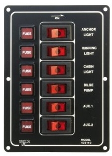 6-fach, vertikal mit beleuchtetem Schaltern und je einem Satz Sicherungen. Zur individuellen Beschriftung liegen passende Aufkleber bei.