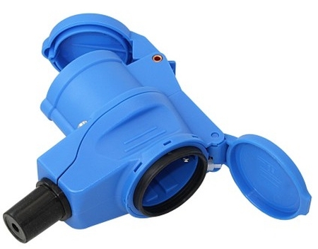CEE Winkelkupplung 230 V - 16 A - 3 polig, mit integrierter Schutzkontaktsteckdose, IP44 spritzwassergeschützt