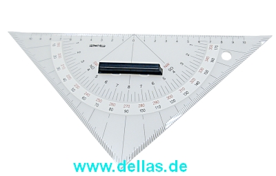 Kursdreieck, Acryl 2,4 mm, mit Griff und Markierungsloch, Winkeleinteilung 360°-1°. Teilung der Hypothenuse 1 mm, Nullpunkt in der Mitte, Länge der Hypothenuse 250 mm