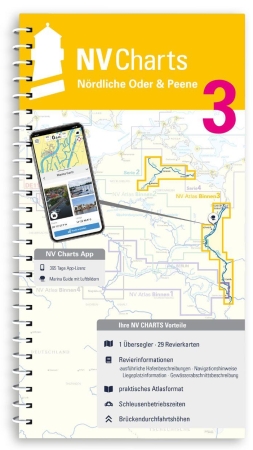Wer entlang der deutsch-polnischen Grenze die Oder bis ins historische Stettin reisen möchte, der sollte sich mit dem Binnenband 3 von NV Charts auf die Reise machen. Von Eisenhüttenstadt stromabwärts zum Stettiner Haff lässt sich die dünn besiedelte Umgebung sowohl auf polnischer als auch auf deutscher Seite genießen. Auf Grund der Strömung und des niedrigen Pegels der Oder eignet sich dieses Gewässer besonders gut für Motorboote. Übers Stettiner Haff gelangt man über Anklam in die Peene, gern auch Amazonas des Nordens genannt. Der Kartensatz beinhaltet 29 Revier- und Detailkarten.