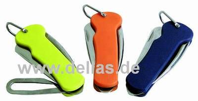 Seglermesser, mit farbig verkleidetem Kunststoffgriff, komplett mit Marlspieker und Schäkelöffner, Klinge zur Hälfte verzahnt.